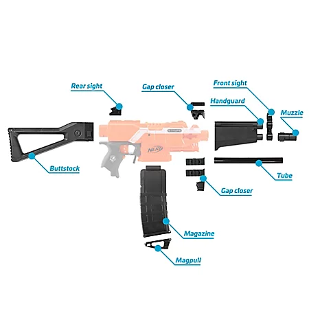 Das Blasterparts SMG-Kit 1 verwandelt die orange Stryfe, Elite 2.0 Phoenix CS-6, Nerf Alpha Strike Flyte CS-10 und weitere Blaster äußerlich äußerlich in eine MP5. Durch die enthaltenen Anbauteile, die einfach auf die Aufnahmen und Aussparungen des Blasters aufgesteckt werden können, wird eine realistische Optik erreicht. Ein bisschen zusätzliche Farbe kann das Erscheinungsbild noch weiter abrunden.