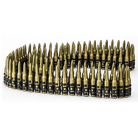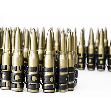 Dieser MG-Patronengurt aus Kunststoff sieht wirklich täuschend echt aus. Die Halterungen jeder Patrone lassen sich einzeln entfernen wie beim echten Vorbild. Dadurch ist der Gurt größenverstellbar oder teilbar und es lassen sich natürlich mehrere Gurte zu einem langen Gurt verbinden. Ein Gurt hat eine Länge von 1,50 Metern und besteht aus 96 Patronenimitaten.