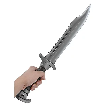 Dieses postapokalyptische Kampfmesser hat das robuste Aussehen eines Survival Knifes: Eine scharfe Klinge mit Sägerücken. Die stahlfarbene Klinge ist auf einem braunen, strukturierten Ledergriff montiert, der einen guten Halt bietet. Die gesamte Waffe ist aus sicherem Schaum gefertigt, der sie für ein Leben in der Einöde haltbar und belastbar macht. Das Polstermesser ist perfekt um in jedem modernen oder future Larp-Setting verwendet zu werden.
