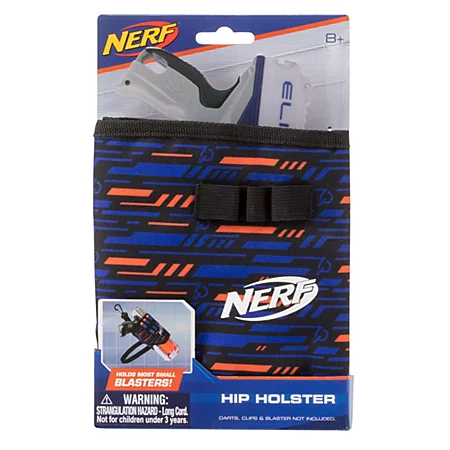 Das leicht gepolsterte Material ist im coolem Nerf Elite-Design bedruckt, so dass der Holster optisch gut zu Nerf-Blastern der Serie passt. An Schlaufen auf dem Stoff können Ersatzdarts befestigt werden.