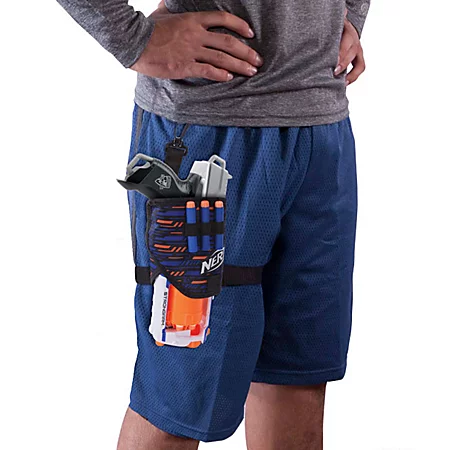 Der Holster lässt sich durch Klettverschlüsse verstellen, so dass verschiedene Blaster (in etwa zwischen Firestrike und Disruptor) hineinpassen. Er kann durch den Clipverschluss an einer Gürtelschlaufe befestigt werden. Das elastische Band für den Oberschenkel sorgt für einen sicheren Halt auch beim Rennen.