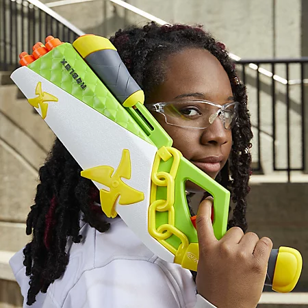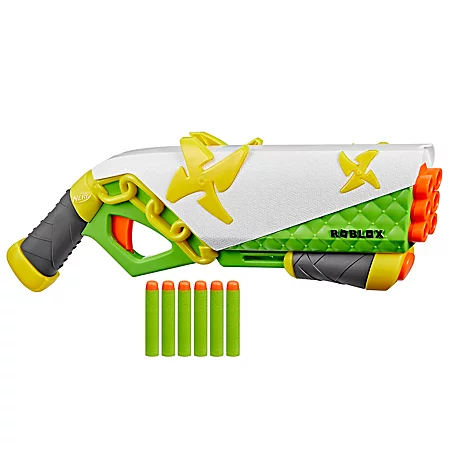 Der Blaster enthält 6 Nerf Elite Darts, um ihn vollständig zu laden. Wird dann der Pumpgriff vor- und zurückbewegt, und der Abzug gedrückt, fliegt 1 Dart seinem Ziel entgegen. Ein toller Blaster für Roblox Fans und Nerf Battlers, wenn im Ninja Style Darts abgeschossen werden.