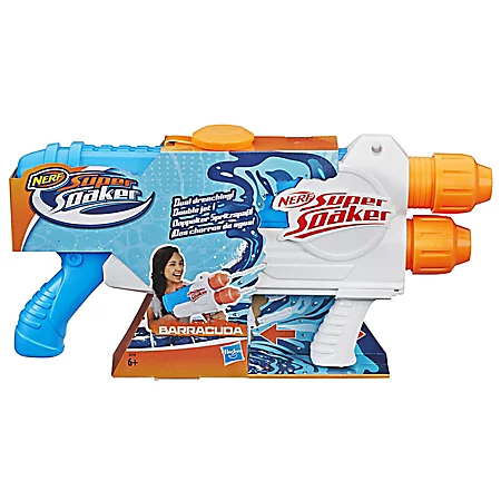 Der Super Soaker Barracuda Wasserblaster ist mit zwei vertikalen Läufen und einem Pumpgriff ausgestattet: Damit ist doppelter Wasserspaß angesagt und ein Überlegenheit in der Wasserschlacht garantiert. Bewegt man den Griff gleichmäßig vor und zurück schießen zwei durchgehende Wasserstrahlen aus den beiden Düsen. Der Barracuda Doppellauf-Blaster ist in kühlen Farben gehalten: Weiß und Blau, aber mit orangene Akzenten.