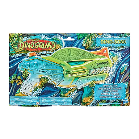 Die Dino Squad Dino-Soak Super Soaker von Hasbro ist leicht zu befüllen und verspritzt Wasser durch vor- und zurückschieben des Pumpgriffs.