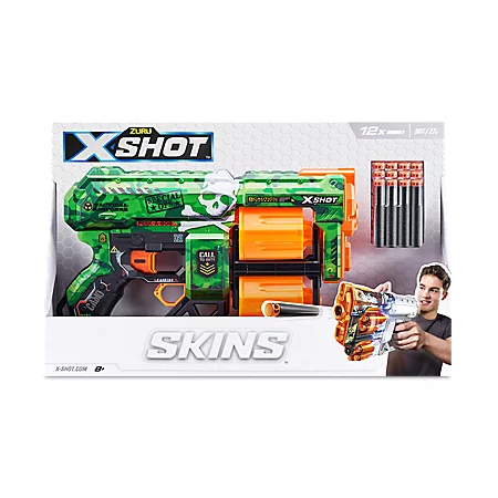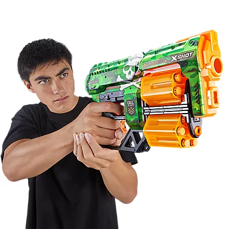 X-Shot Skins bringt das Spielerlebnis, deinen Blaster zu skinnen, in die reale Welt. Wähle deinen Skin und zieh in die Schlacht. Der X-Shot Skins Dread Camo ist ein handlicher Blaster in der Skins-Reihe und vereint epische Feuerkraft, Geschwindigkeit und Präzision in einem Blaster. Mit dem automatisch rotierenden Trommeln und einer Kapazität von 12 Darts kannst du mehrere Ziele auf bis zu 27 m treffen. Dank der einfach zu bedienenden Doppeltrommel lassen sich 12 Darts in Sekundenschnelle abfeuern. Der Dread Blaster wird mit einem taktischen Griff und einer Schiene zum einfachen Nachladen geliefert und ermöglicht es dir, deinen Blaster mit Zubehör aufzurüsten. Der X-Shot Skins Dread Blaster kommt in 4 einzigartigen Skins zum Auswählen und Sammeln. Wähle anders, wähle X-Shot Skins.